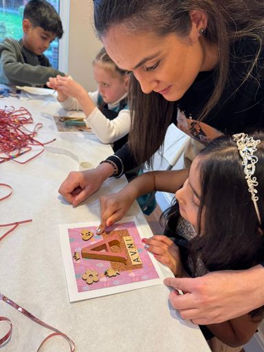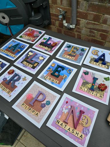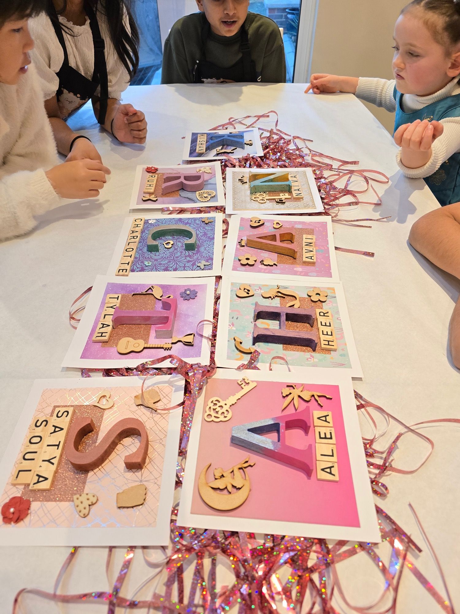 Our signature craft experience centres around personalised name frames. Each child designs and decorates their own frame, choosing colours, backgrounds and embellishments to make it truly their own.